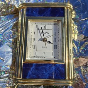 BULOVA Quartz Clock Blue Gold Mantel Shelf Clock Brass RARE Vintage Alarm
