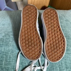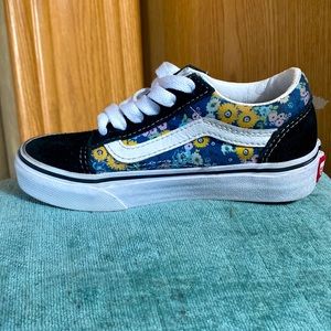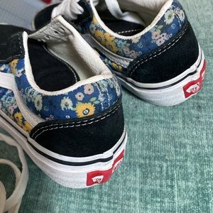 Excellent condition Vans old school low top skate shoes. black suede accompanied by a denim blue floral canvas and signature white leather stripe. These shoes look brand new, the shoelaces are bright white.
