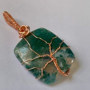The lush green hues of the moss agate evoke a sense of tranquility and connection to the natural world, making this pendant a symbol of harmony and balance. The Tree of Life wirework, intricately crafted in copper, adds a touch of symbolism, representing growth, strength, and the interconnectedness of all life.