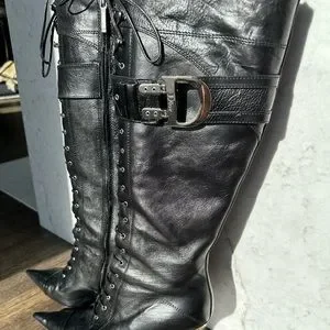 Product Details: Vintage tall black leather pointed-toe boots by Christian Dior. From the Fall/Winter 2000 John Galliano Collection. Buckle accents at sides. Lace-up detailing at tops. Zip closures at inner sides. 14" shaft height, 4.25" heel height.