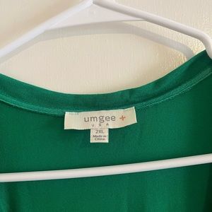 Umgee green dress size 2x. I love this dress I just don’t have anywhere to wear it. Can be a little see through as shown in the pictures but it is not noticeably see through. I have never worn this dress