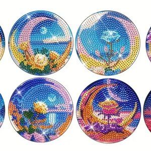 I made these 8 beautiful moon coasters with various colors of acrylic & resin rhinestones. They are sealed, have a corked backing and measure 3 3/4”. It also comes with the metal holder.