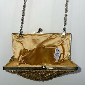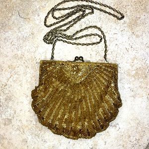 Vintage 50-60’s La Regale Golden Beaded Clutch Kiss Lock Clam Shell Evening Bag.