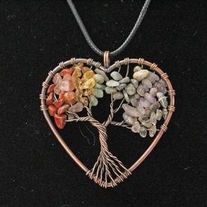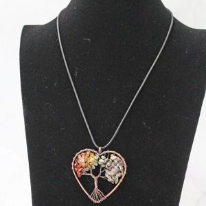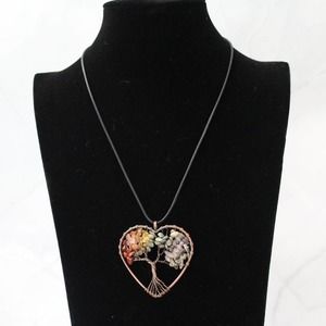 The new fashion red copper heart shaped tree of life pendant is 2x2 inches in size. The leaves are made from crystal chip beads. The black cord necklace can be worn between 18 and 20 inches