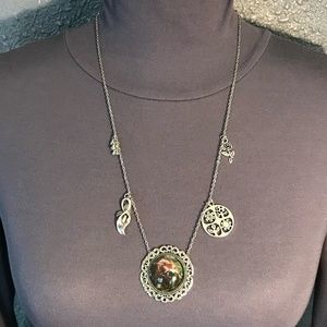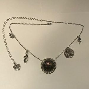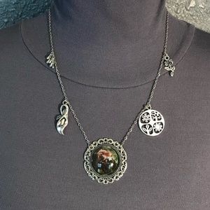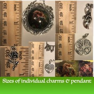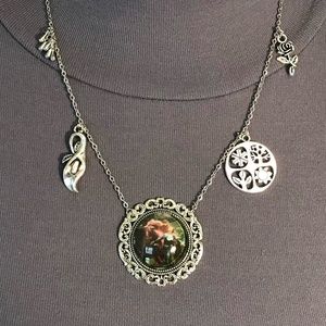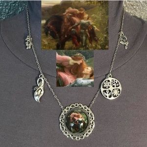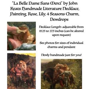 This unisex necklace features (from left to right), first silver charms of dewdrops, since Keats uses the dewdrops in nature to illustrate the effect La Belle Dame has on the knight. Next is Lily charm, since Keats uses the Lily (often associated with death) to reflect the paleness of the knight and to foreshadow his misfortune. In the center is a portrait style painting pendant of the knight and La Belle Dame surrounded by a silver filagree frame. To the right is a 4 seasons charm, since the various seasons play a key role in the depiction of La Belle Dame. Last is a rose charm, since roses are also a symbol of the knight's love. This necklace has been newly handmade just for you, and is adjustable from 19.25 to 27.5 inches (can be altered upon request).