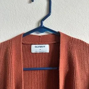 Step into comfort with this gently used Old Navy cardigan. Perfect for those breezy days or chilly evenings, this rust-colored knit cardigan is a must-have for your casual wardrobe. Its open-front design and soft, textured fabric offer both style and ease, making it an ideal layering piece. Features include ribbed detailing, long sleeves, and convenient front pockets. Embrace the blend of warmth and fashion with this versatile cardigan!