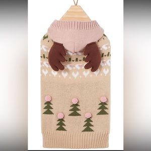 NET Xmas dog sweater. Size med knitted w/ hood w/ antlers. Leash hole.