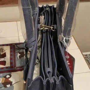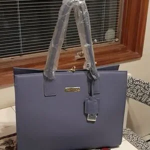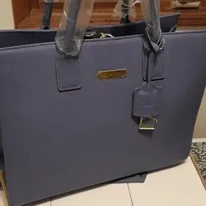 NWOT Joy & Iman periwinkle/ lavendar designer handbag. It is a beautiful handbag, even better in person. Perfect for Spring! It is brand new, still has the protective plastic on the handles and on the goldtone hardware throughout the bag. It measures 15" wide, 5 1/2" deep (empty), and 12" tall. It has at least 8 individual storage spaces inside as well as zippered compartments. It has a mirror on the inside and comes with a key fob on the outside which has a goldtone watch that compliments the bag. The bottom has goldtone bars on each side and four goldtone round bottom Studs protecting the bag when setting it down. You will absolutely love this handbag or it would be perfect for someone on your gift list!
