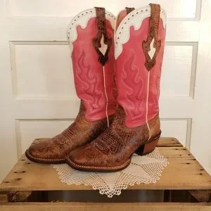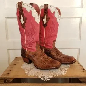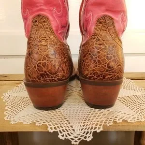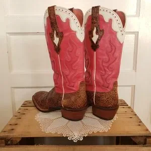 💗 Vintage Authentic Western Distressed Genuine Leather Cowgirl Boots 💗 Barbie Movie Pink w/ Brown Croc Leather Design 🌸 Cosplay Dress-up Costume 🌸 Rodeo Square Toe Round Up 🌸 Leather Lined 🌸 Laser-cut Inlays Embroidered 🌸 Womens 8.5 👣