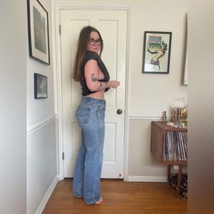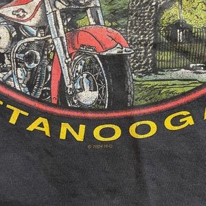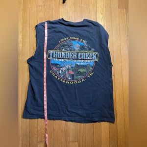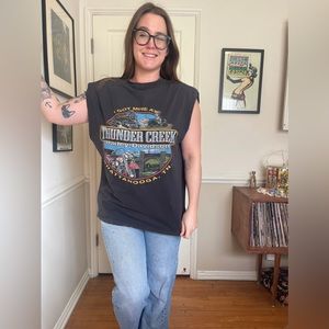 This Y2K vintage Harley T is super cool. It is a black T shirt with both front and back graphics - the front graphic features a red Harley a steam engine and a bridge - text around the graphic says "got it at Thunder Creek" Chattanooga TN. On the back it says Life begins when you get one. The graphics on the shirts are copyright 2003/2004. The sleeves have been cut off the shirt to make it a tank, there are a couple of other flaws to the shirt including a little bleach stain along the bottom and small holes throughout - gives it more charm IMO and adds to a "thrashed" look. Has no size tags - see measurements in photos. Approximately an XL
