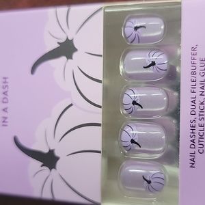 Nail dashes, glue on nails. comes with the nail tips, file/buffer, cuticle stick, and nail glue. these are reusable. size is meant for a young girl, teen. Halloween fall theme. pumpkins. NWT