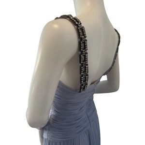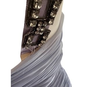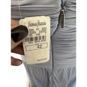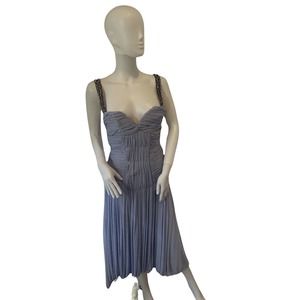 ***This dress is vintage and still has tags from Neiman marcus attached. Orig.$3500 It has been hanging in a closet for some time and one of the straps is loose and needs to be fixed and there are pulls in the dress from being next to other dresses( not super noticeable , but I dont think fixable) . price reflectsThis stunning purple midi dress by Roberto Cavalli is the perfect addition to any party or cocktail occasion. The sweetheart neckline and sleeveless design give it a sexy and sophisticated look. The rhinestone straps are amazing.The dress features a zip closure and is made from a lightweight silk blend crepe fabric that is perfect for all seasons. The dress is a size 6 or 42 IT and has never been worn, with its original tags still attached. Its vintage style adds an extra touch of elegance. The dress should be dry cleaned only and was made in Italy. Don't miss out on this beautiful piece from Roberto Cavalli, a must-have for any fashion-forward woman.