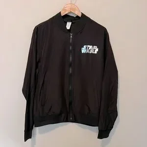 NWT Disney Star Wars Stormtrooper lightweight bomber style jacket. Black. Silver logo and art on back. Ribbed collar, cuffs and hem. Size M. Length 25”. Armpit to end of sleeve 21”. Pit to pit 22.5”.