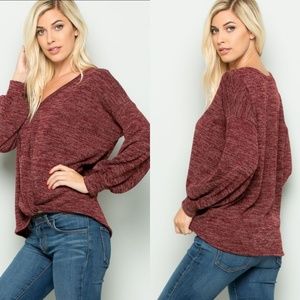 Wine/burgundy twist front marled knit top with puff sleeves. Banded sleeves. V-neck. Made in the USA. 85% polyester, 12% rayon, 3% spandex. (Color is more purple than red in my opinion)