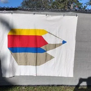 Amazing massive screen-printed fabric, signed and dated 1974, of a primary colored pencil. I am leaving the mounting / stretching to new owner since the finished size is very flexible, plus, this way I can offer free shipping.