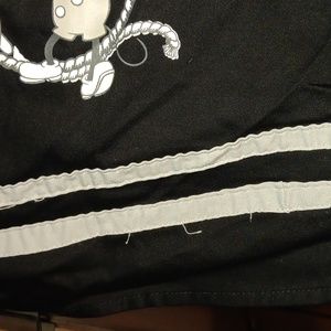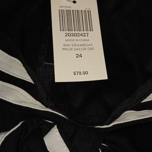 Hop aboard the steamboat in style! Get ready to say, "Ahoy!" with this black sailor dress inspired by the Walt Disney classic, Steamboat Willie. Featuring a grey-striped sailor collar and bow at the neck and iconic images of Mickey Mouse and his steamboat printed along the border with more stripes. Comes with a removable belt and side seam pockets. Complete with a back zipper closure.