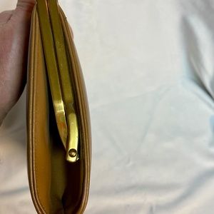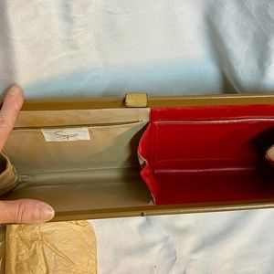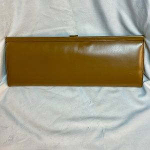 A rare find! This amazing long clutch makes a statement, especially for the vintage lover. A beautiful golden tan leather with patinated gold clasp and sides. To be honest, I'm not sure how old this is but I suspect it is from the 60s and possibly 50s. Extraordinary condition for its age with only a few small marks indicative of its age, (see photos). Made for Simpsons, the interior features 2 separate areas, one in red and one in beige. Each area has a smaller open pocket. One even has a small mirror wrapped in wax paper! Price reflects its specialness, great condition and rarity, (ignore the original price listed). Measures approximately 14.5" X 6" X 1.25".