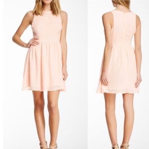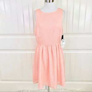 BB Dakota peach textured chiffon sleeveless fit and flare mini dress. Rear zip. Fully lined. High neckline.