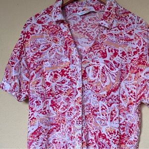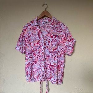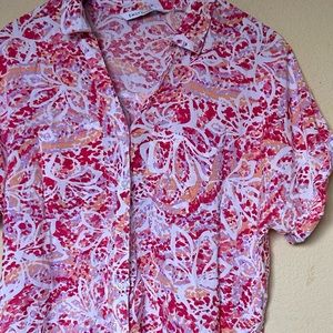 3/$20 Emily Daniels, pink and orange swirl pattern button down with front tie