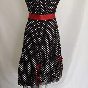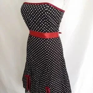 Like New. Worn once. Black strapless a line pinup vintage 1950's dress with white polka dots & red trimming details. Bottom of the dress has a black lining with lace detailing. Zipper on back. Red ribbon on waist is an addition I made. It is not original to the dress. Reasonable offers considered. Smoke free home.