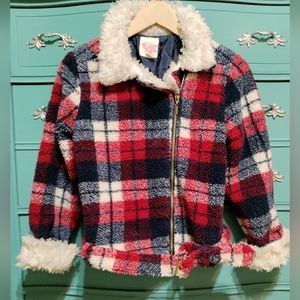 GB girls lined, faux fur collar and cuffs, zip up, belted jacket. Size Large. Super cute, very warm but not heavy. Plaid design in red, white and blue. Belt around bottom of jacket.