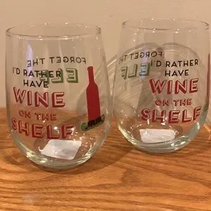 NWT set of 2 Christmas wine glasses 17oz. Each glass reads “Forget the elf” on one side and “I’d rather have wine on the shelf” on the other side. What a great Christmas gift by itself or just add a bottle of wine.
