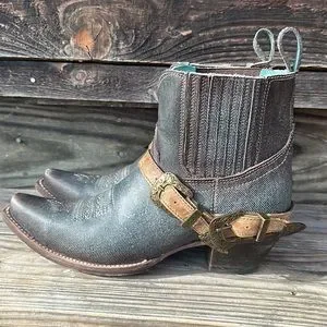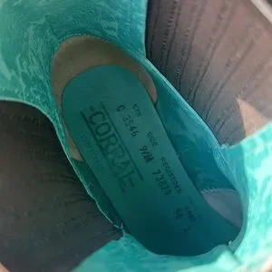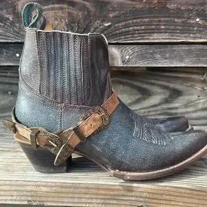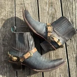 Super cool Corral leather boots. Distressed blue with brass/gold buckles. Pull on. No zipper. Women’s 9.5. Very nice condition only worn a few times.