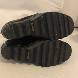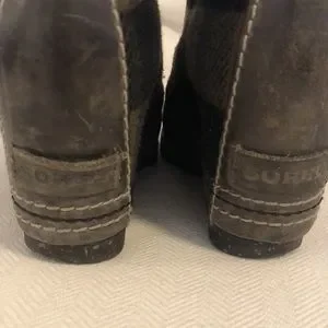 Sorel pdx wedge boots in green plaid flannel. These are factory marked a 5, but I am an avid sorel wedge wearer and these are bigger than my 5 and 5.5 wedges. I think they are a 6? I measured the insole at 9.5 inches. See photos for wear on heels and sole.