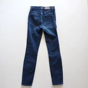 - medium blue wash - light fading on thighs - high rise - skinny leg size: 24. condition: no stains or holes.