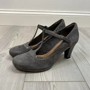Ladies Clarks Court Heel Shoes Chorus Pitch Gray Size 10 Suede T Strap 9.5