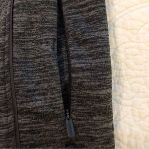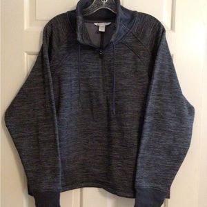 Athleta quarter zip, charcoal, size XL, polartec powerstretch sweatshirt - smooth on the outside, cozy fleece inside. Relaxed, boxy fit, slightly cropped 25" length. Zip up high funnel neck with drawstrings. Hidden zippered pockets at each side seam. Thumbholes in sleeve cuffs. Adjustable toggle/elastic drawstring at hem to keep the wind out. Pit to pit 24.5".