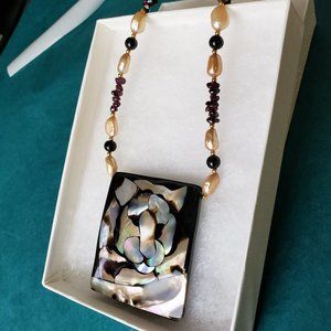 Gorgeous Vintage Lee Sands Mountain Lion Face Necklace with Shell and Resin Pendant and Pearls and Garnets Chain.