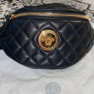 Versace White Leather Quilted Medusa Belt Bag. Front zip pocket. Black textile interior lining. Single contrasting black interior card slot. Adjustable strap. Gold-tone hardware. Tonal stitching.