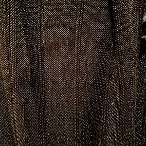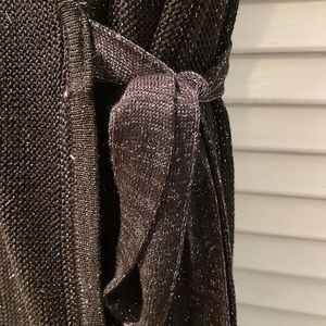 Self tie allows for a certain amount of personal sizing. Dress is knit with silver sparkles, wrap style. Straps not adjustable. About 56” long from top of strap to hem. Never worn, with tags. In new condition.