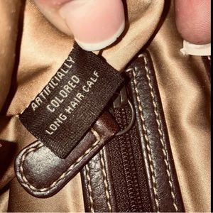 Flap/snap closure with beige sateen interior. Minor rubbing in area of calf hair is noted. Size is M/L w/ 2 inner compartments and a zippered pocket. Rivets on the bottom. Brass hardware with brown leather. Beautiful preowned condition. Rare and HTF!
