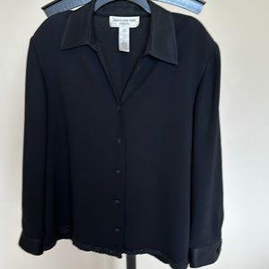 V Neck line, nice buttons and, satin on collar and wrist area. No pockets on pants. Nice Jones NY Quality.