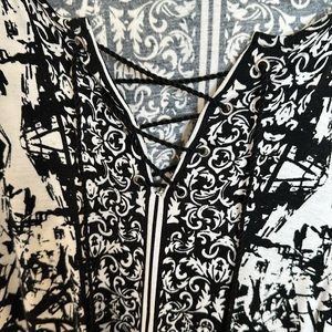B&W with criss cross top, side slits, 1X. Very comfortable material.