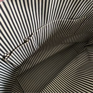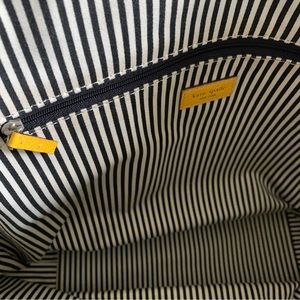 Authentic Kate Spade durable black canvas tote bag with beautiful bright yellow accents. Silvertone brand embossed hardware. Smooth, easy to carry handles with 6” drop. Clean black and white striped fabric interior has large zipped compartment and 2 slide pockets. Branded silvertone feet on bottom. Great size for use as a travel bag or weekender! Measures 14”Lx17”Wx6”D. Wear on bottom corners, handle and interior rim as pictured from normal use. 2nd owner; boutique consignment find. Well cared for. No dust bag. Excellent condition! HL:22