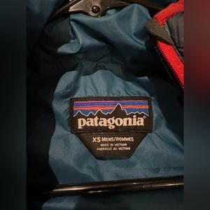 patagonia nano puff pullover with front zip pocket and hood!!! blue and red. EUC.