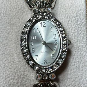 Gorgeous hinged cuff bracelet watch. Silver with crystals around bezel and on top of bracelet. Face of watch is a brushed silver. Never used but has been sitting so it will need a new battery. All jewels are present around bezel and on bracelet. A very stunning piece of jewelry! Bezel size is 31.75mm x 25mm.