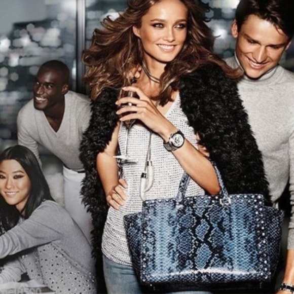 Add a touch of glamour and class to your wardrobe with this beautiful must have embellished Large Selma satchel tote bag from MICHAEL Michael Kors. This bag is crafted Denim snake-print leather with clear jewels and silver color stud trim.