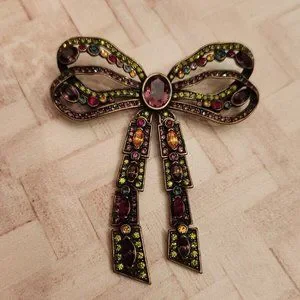 Heidi Daus Ribbon Bow Bronze Tone purple yellow 3" Brooch Pin Signed