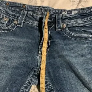 Good pre-loved condition Miss Me Boot cut jeans size 30. Tag says inseam is 34 but these jeans have been hemmed to 31”. Lots of life left in these with the beautiful wing back pockets.