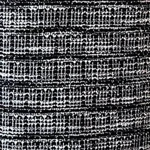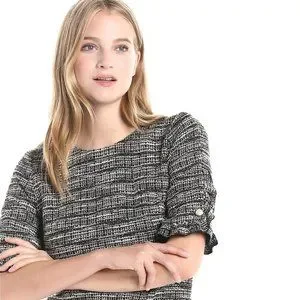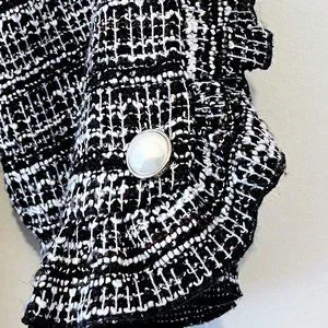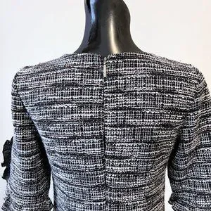 This Karl Lagerfeld Paris dress is a mini dress in rust multi color with ruffle trimmed sleeve and faux pearl accent. The fabric has textured woven look. The color of the dress depends on the lighting and the distance. In the stock picture the dress looks grey and looking closely it has textured pattern made of dark red, brown, black and white yarn. The dress is fully lined with a crepe like fabric in black.