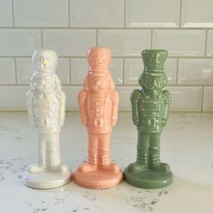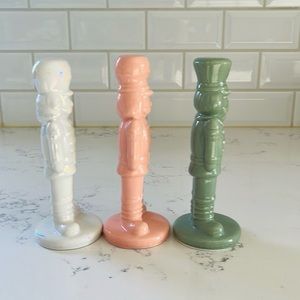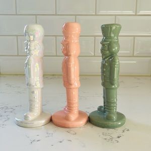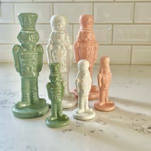 Target Bullseye’s Ceramic Nutcracker Figurines. Set of 3. Set the stage for a holiday full of magic and revelry with these brightly fashioned collection of ceramic Holiday Nutcrackers. Great looking and versatile for your holiday display. Colors: one iridescent white, one green and one pink. Material: ceramic. Approximately measurements: 6 1/2” tall. Please note that due its nature they might have small not very noticeable flaws. Complete the collection by adding the mini nutcrackers (sold separately). Excellent conditions. Brand new with tag