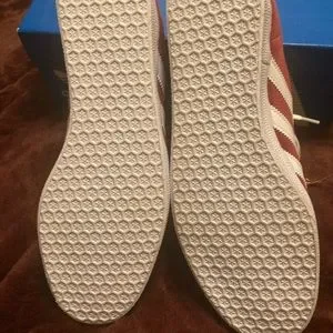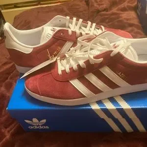 Men’s Adidas Original Gazelle light Burgundy/white stripe suede sneaker. Very comfortable and stylish. The upper is made of nubuck.