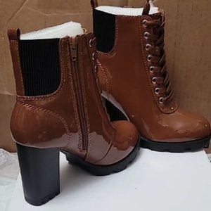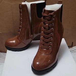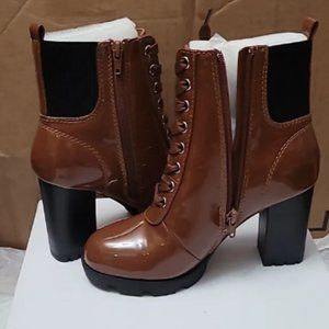 Cognac Patent Leather Zip Lace Up Platform Booties High chunky heel Size 6.5 New