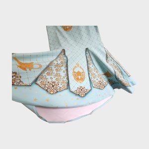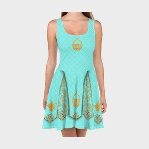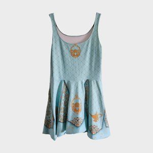 New without Tag. Light Teal - Blueish Greenish Color with Aladdin Movie Symbols like the castle and lamp, Sleeveless, Scoop Neck, Flared Skater Skirt. Super lightweight and stretchy! 82% Polyester, 18% Spandex. Tagged size XL.