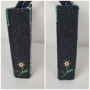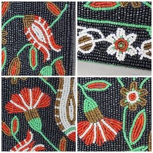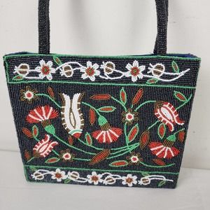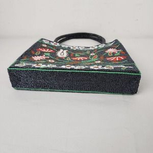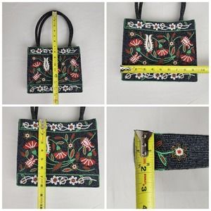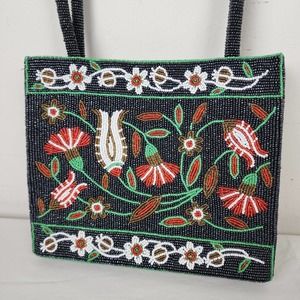 Vintage Handbag Glass Seed Beaded Floral Purse Black Red Flower Vietnamese