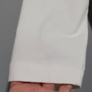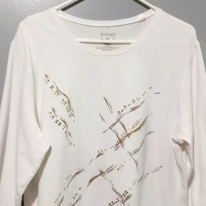 Pre-owned but excellent condition almost new, women's long sleeves white top, crewneck, 95% cotton, 5% Spandex, well washed, no rips, flaws or bad odors, very comfy, golden printed, size 3""